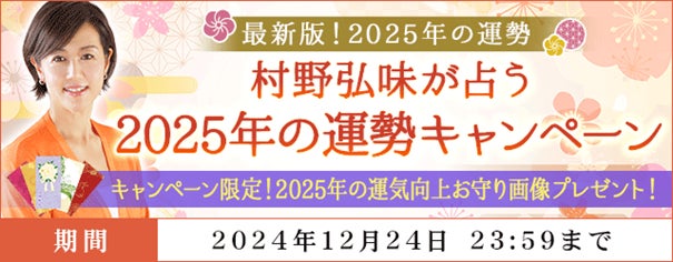 TV番組等で活躍中の占い師・村野弘味の月額公式サイト『村野弘味の四柱推命』にて『2025年の運勢|村野弘味が占う2025年の運勢キャンペーン』を公開いたしました。本キャンペーンでは、人生/恋愛/結婚/仕事運などの対象鑑定を占うと、お悩みに合わせた2025年の運気向上お守り画像をプレゼントいたします。この機会をどうぞお見逃しなく!