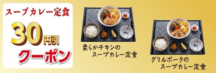 宮本むなし公式アプリでは3月10日(火)まで何度でも使用できる「スープカレー定食各種30円引き」クーポンを配信しておりますので、お得にご利用ください。