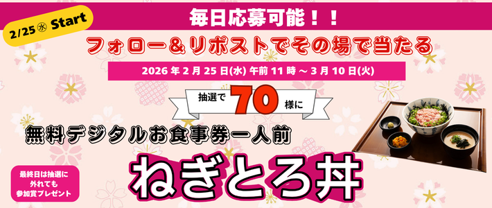 あわせて2026年2月25日(水)午前11時~2026年3月10日(火)の期間に「宮本むなし公式Xフォロー&リポストキャンペーン」を実施いたします。宮本むなしの公式Xアカウントをフォローし、キャンペーン投稿をリポストすることで期間中毎日応募でき、その場での抽選で定食屋宮本むなし店内で「ねぎとろ丼」(890円税込)1人前をお召し上がりいただけるデジタルお食事券が当たるキャンペーンです。ぜひこの機会に宮本むなし公式Xのフォロー&リポストでのご参加をお待ちしております。