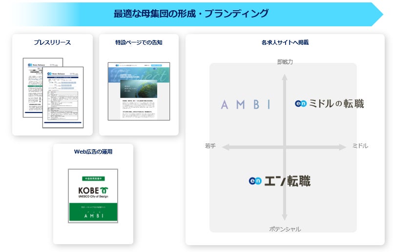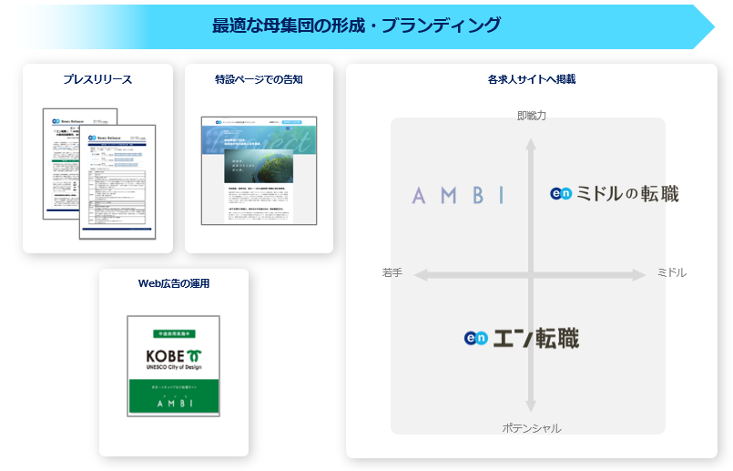 プレスリリースや特設ページ、Web広告での告知に加え、各求人サイトでの集客サポートを実施。『エン転職』『AMBI』『ミドルの転職』とターゲットの異なる3つの求人サイトを活用することで、ターゲットへ網羅的に求人を届けました。
