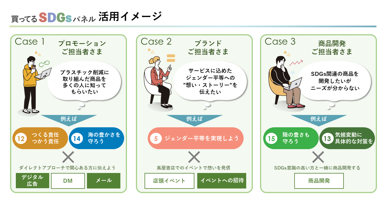 実際の「SDGs関連購買行動層」を捉えたパネルのため、CCCマーケティングのソリューションと掛け合わせることで、生活者共創型のSDGs関連商品の開発や、SDGs関連商品のサンプリング、対象商品購入のユーザー層の可視化など、企業が取り組むSDGsへの貢献活動をサポートいたします。