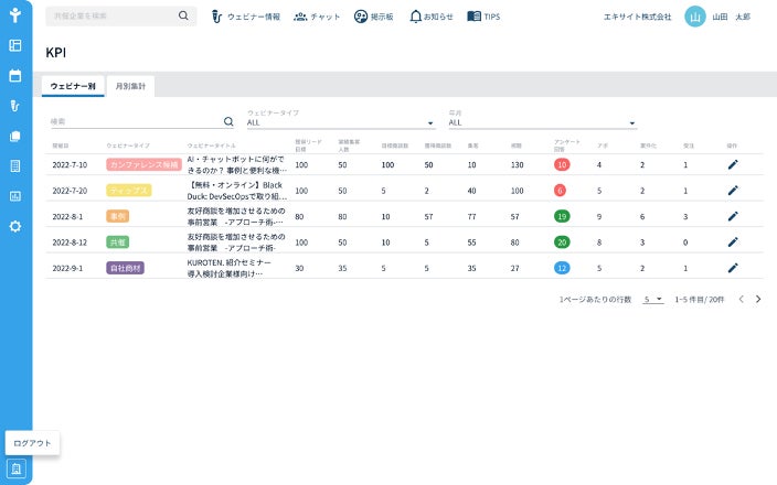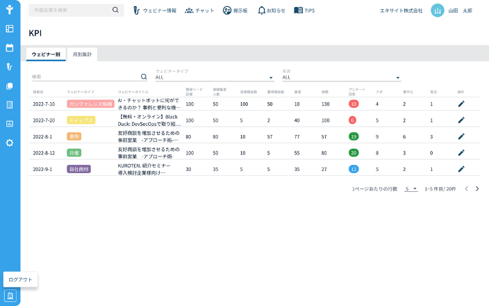 1. 開催ウェビナーごとのKPI管理:実施したウェビナー単位での集客目標や実績、さらには商談に繋がっているかなどの主要KPIを管理することができます。