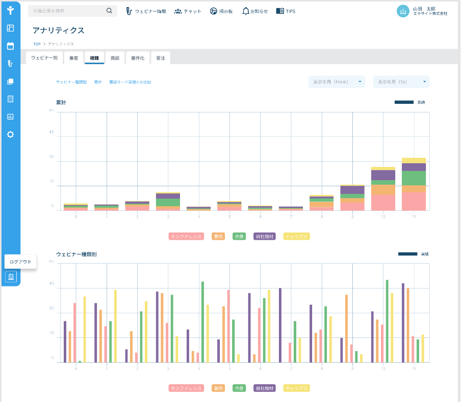 2. 月次やカテゴリ単位での成果を確認できるダッシュボード:当月のウェビナーの成果や、カテゴリごとの成果をグラフ表示させることで、成果が出ている企画が何か、また、力を入れるべきウェビナーは何かを可視化することができます。