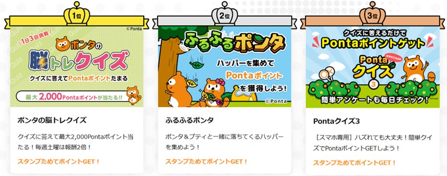 | ランキング特典 | 期間中にPonta PLAYの対象のゲームでためたPontaポイントの合計に応じて、ランキングが決定します。期間終了時点のランキングによって、以下の特典をプレゼントします。 1位 101,010Pontaポイント 6~10位 1,010Pontaポイント 11~100位 510Pontaポイント 101~1,000位 110Pontaポイント 1,001~10,000位 10Pontaポイント 10,001~20,000位 5Pontaポイント 20,001~30,000位 3Pontaポイント 30,001位~ 1Pontaポイント |