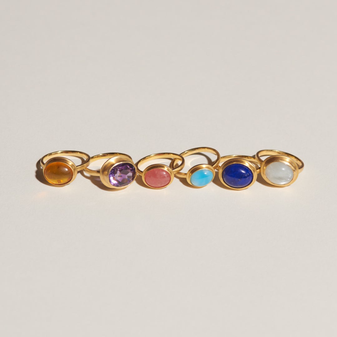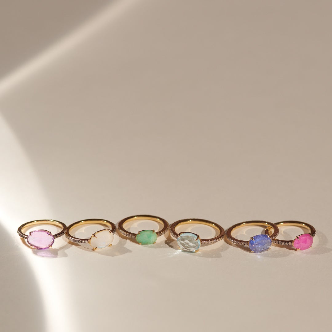 大振りなカボションカットのカラーストーンを覆輪留めして乗せた彩り豊かなリングも、渋谷PARCOにて先行発売いたします。