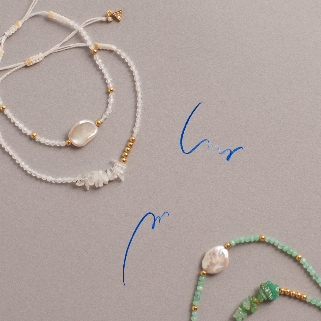 2022 Springの新作“I am” Donationは、碧い海を想わせる、清涼感漂うクリソプレーズと、神聖な印象さえ与える、純白のレインボームーンストーン。ブレスレット、チョーカー、マスクホルダーのラインナップでご用意しました。