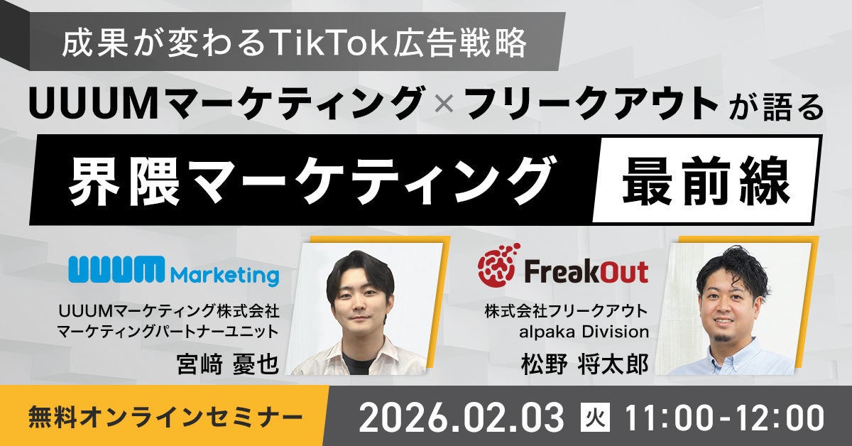 UUUMマーケティング株式会社(本社:東京都港区、代表取締役 社長執行役員:鈴木 司、以下「UUUMマーケティング」)は、株式会社フリークアウト(本社:東京都港区、代表取締役:時吉 啓司、以下「フリークアウト」)と共催で、「〜成果が変わるTikTok広告戦略〜UUUMマーケティング × フリークアウトが語る「界隈マーケティング」最前線」と題したウェビナーを、2026年2月3日(火)11:00〜12:00に開催します。
