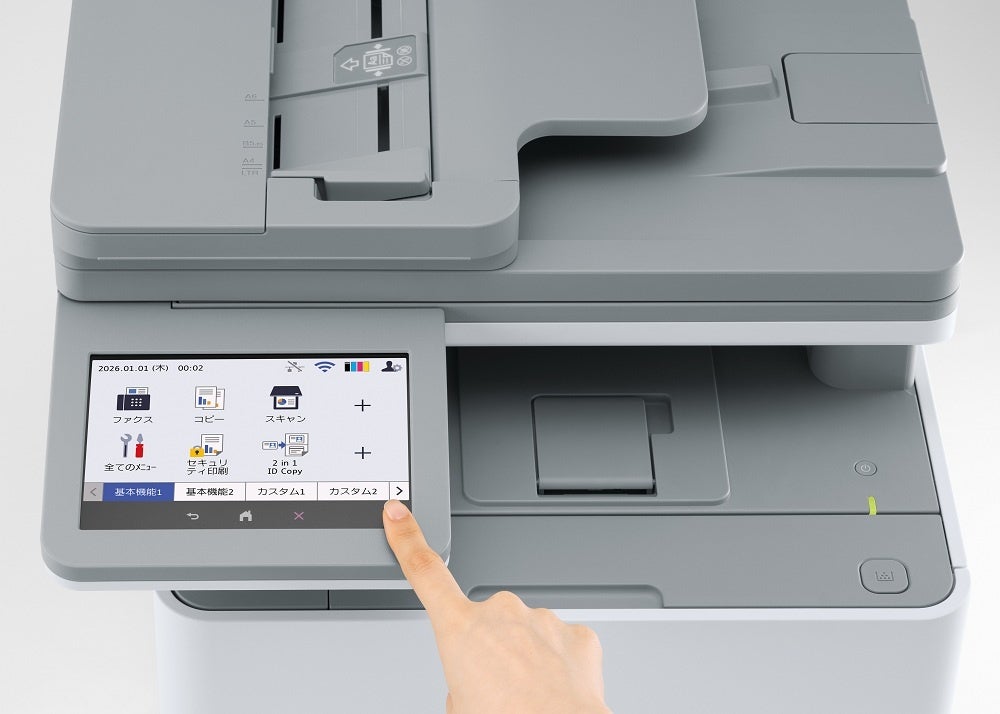 ・・・従来機種【※4】と比べて本体サイズを約28%削減し(対象機種:MFC-L8730CDW)、カラー複合機でありながらコンパクトな本体サイズを実現した。また全機種においてトナー交換や給紙・排紙を前面で行えるフロントオペレーションを採用し、省スペースで快適に利用できる。