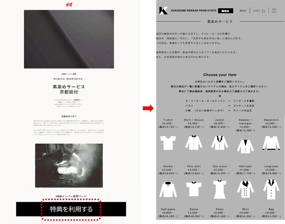 ファッションとクオリティを最良の価格でサステナブルに提供するH&Mは、株式会社 京都紋付(本社:京都府京都市中京区壬生松原町51-1)とコラボレーションし、同社の黒染めサービスを2024年6月5日(水)~12月5日(木)の期間限定で、国内H&Mメンバー会員向けに特別優待価格で提供いたします。上記期間中にH&Mメンバー会員ページからお申込みいただいたお客様は、通常価格から10%OFFの特別優待価格にて当サービスを体験することができます。また、お申込みいただいた先着30名のお客様にケア製品(防虫効果のあるシダーリング)をプレゼントいたします。