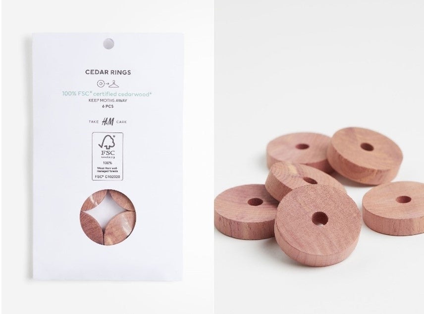 本サービスの受け付け開始後、お申込みから京都紋付への着荷までを完了された先着30名のお客様に、防虫効果のあるシダーリングをプレゼントいたします。ハンガーのフック部分に通してクローゼットにかけるだけで設置でき、さらに香りが弱まってきたら、サンドペーパーで軽く削ることで再び香りが戻ります。本製品は、衣類をより長く使用するためのケア製品としてH&M公式オンラインストアでもご購入いただけます。