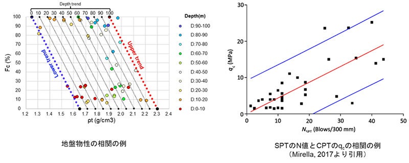 本研究は、CPTとの相関関係の導出に先立ち、SPTによるN値、取得した試料の分析データ及び物理検層データの結果を比較することで、これらのデータの相関について検討したものです。多変量解析によりこれらの関係性を明らかにし、また当該データセットを用いて、一定の精度でN値を連続性の高いデータに変換可能であることが示されました。