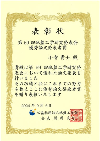 JOGMEC(本部:東京都港区、理事長:髙原 一郎)が実施した地盤工学に関する研究発表が、地盤工学研究発表会において、優秀論文発表者賞を受賞しました。