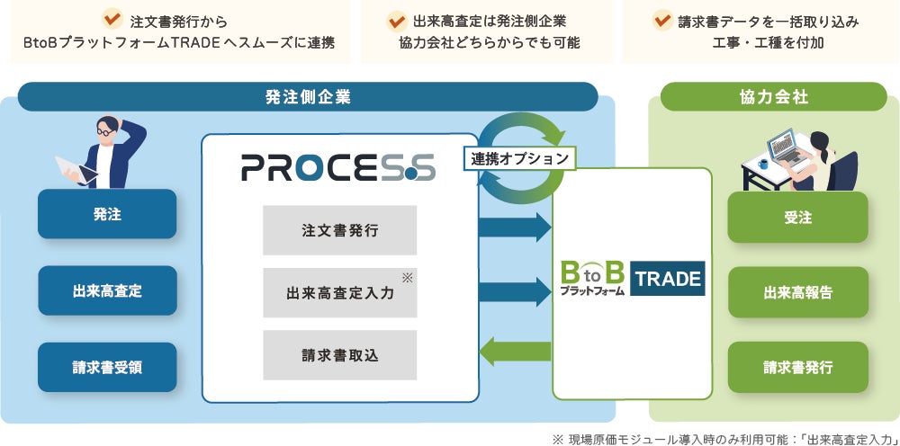 それに伴い、「BtoBプラットフォーム TRADE」および「PROCES.S」はそれぞれ順調に導入先を拡大し、建設業界のDX推進に貢献していますが、両システムの直接的なデータ連携の機能はなく、それぞれ手作業でのデータ入力か個別の連携カスタマイズでの対応が必要でした。既に導入いただいているユーザーや、導入を検討している企業からも両システムの連携を望む声が多数上がっており、今後の建設業における電子化の動きから鑑みてもその声はますます増えることが予測されるため、今回、両システムをシームレスにつなぐ連携オプションの提供を開始しました。