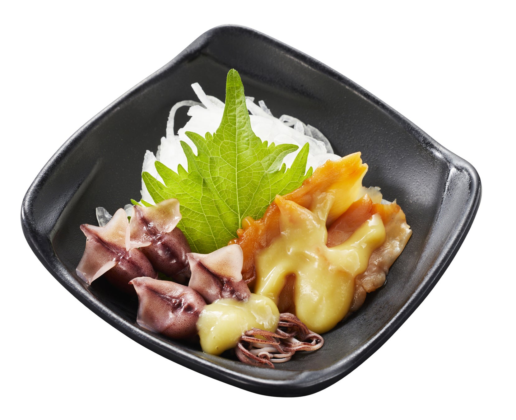 プリっとした食感の「ほたるいか」とコリコリ食感の「赤貝」を、ほんのりからしを効かせた西京白味噌でさっぱり仕立てました。お酒のおともにも最適な逸品です。