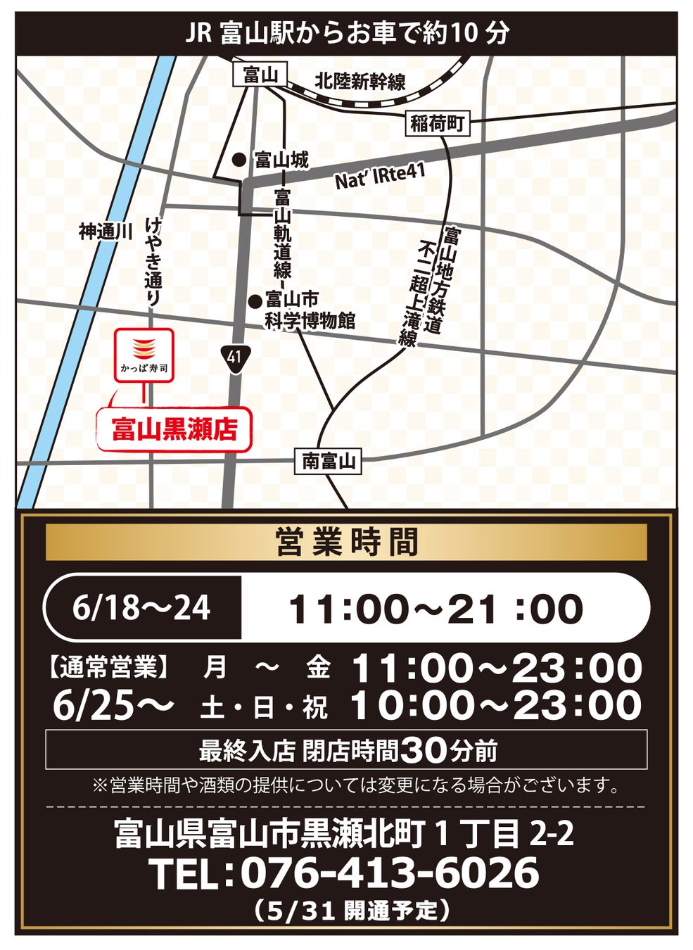 コロワイドグループのかっぱ寿司(カッパ・クリエイト㈱ 本社:神奈川県横浜市、代表取締役社長:山角豪)は、2025年6月18日(水)に『かっぱ寿司 富山黒瀬店』をオープンいたします。