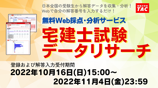 宅建試験対策講座を展開しているTAC株式会社(東京都千代田区、代表取締役:多田敏男)は、10/16(日)に実施される『令和4年度宅建試験(宅地建物取引士試験)』の解答速報を試験当日にTACのWebサイトで公開いたします。