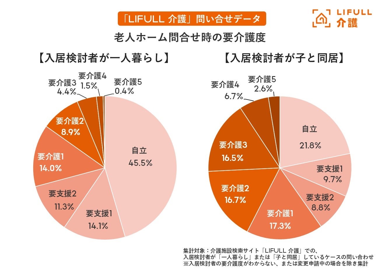実際の「LIFULL 介護」の直近1年間の老人ホーム問い合わせデータから、一人暮らしの方と子と同居している方とで、老人ホーム問い合わせ時の介護度と入居希望時期の内訳を比較しました。
