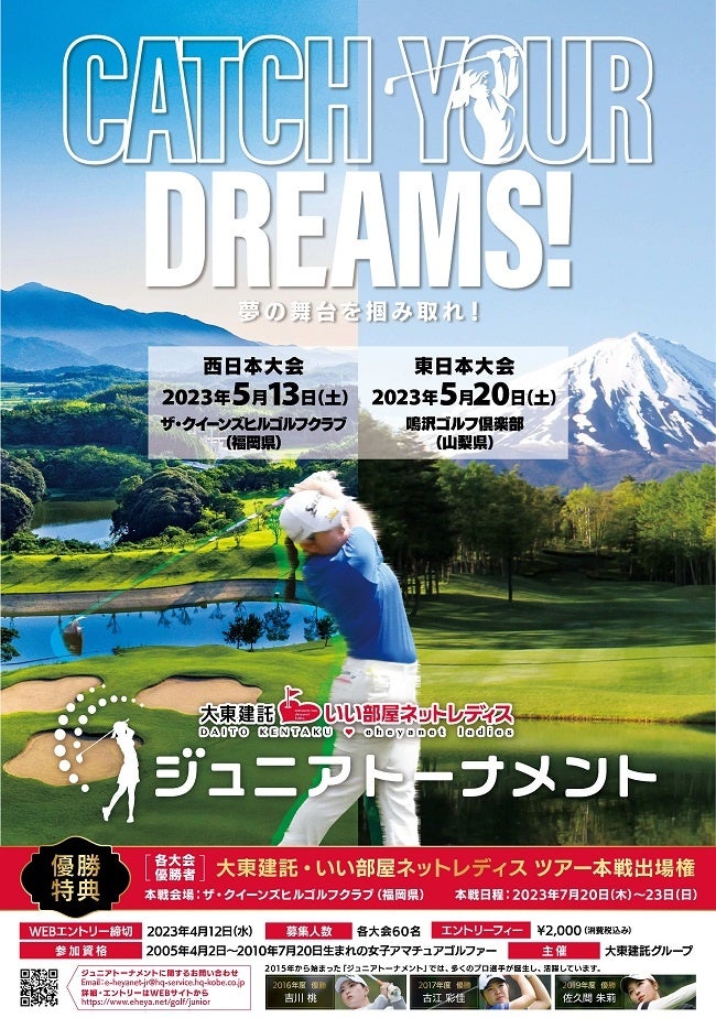 8回目となる今回は、昨年同様、より多くの方にご参加いただくため、東日本・西日本の2会場で開催します。5月13日の西日本大会は「ザ・クイーンズヒルゴルフクラブ(福岡県糸島市)」、5月20日の東日本大会は「鳴沢ゴルフ倶楽部(山梨県南都留郡)」での開催となります。 なお、各大会の優勝者には、2023年7月20日(木)から7月23日(日)の4日間、西日本大会の会場でもあるザ・クイーンズヒルゴルフクラブ(福岡県糸島市)での開催となる、JLPGA公認トーナメント「大東建託・いい部屋ネットレディス」の本戦出場権を与えます。 当社は、ジュニアトーナメントの開催を通して、ジュニアアスリートの育成と日本ゴルフ界のさらなる発展に貢献していきます。
