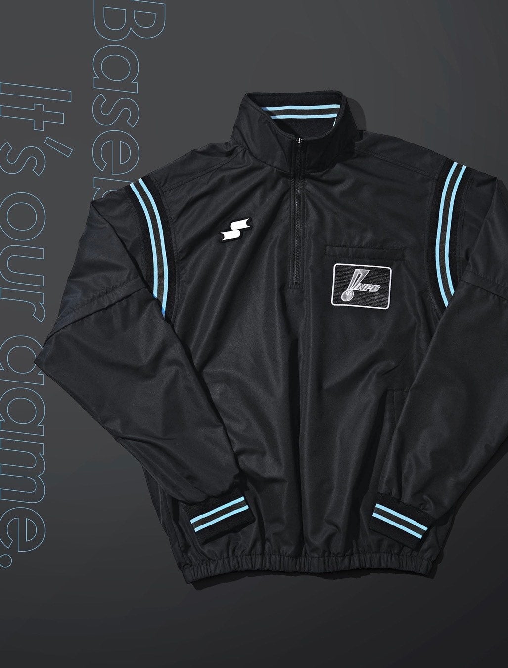 デザインはマットなブラックを基調としつつ、鮮やかなNPブルーのラインをアクセントとして配色し、落ち着きと存在感を兼ね備えたスタイルに仕上げました。防風性に加え、軽さと撥水性に優れた高機能ポリエステルを採用。長時間の試合でも重さを感じさせない軽快な着心地で、突然の雨や夜露にも対応し、ジャッジに集中できます。また、インサイドプロテクターに対応しているため、球審の時にも快適に着用が可能。防護具を装着した状態でも動きを妨げず、機能性と見た目の両面で審判に求められる信頼を育みます。