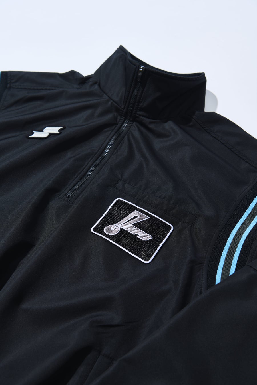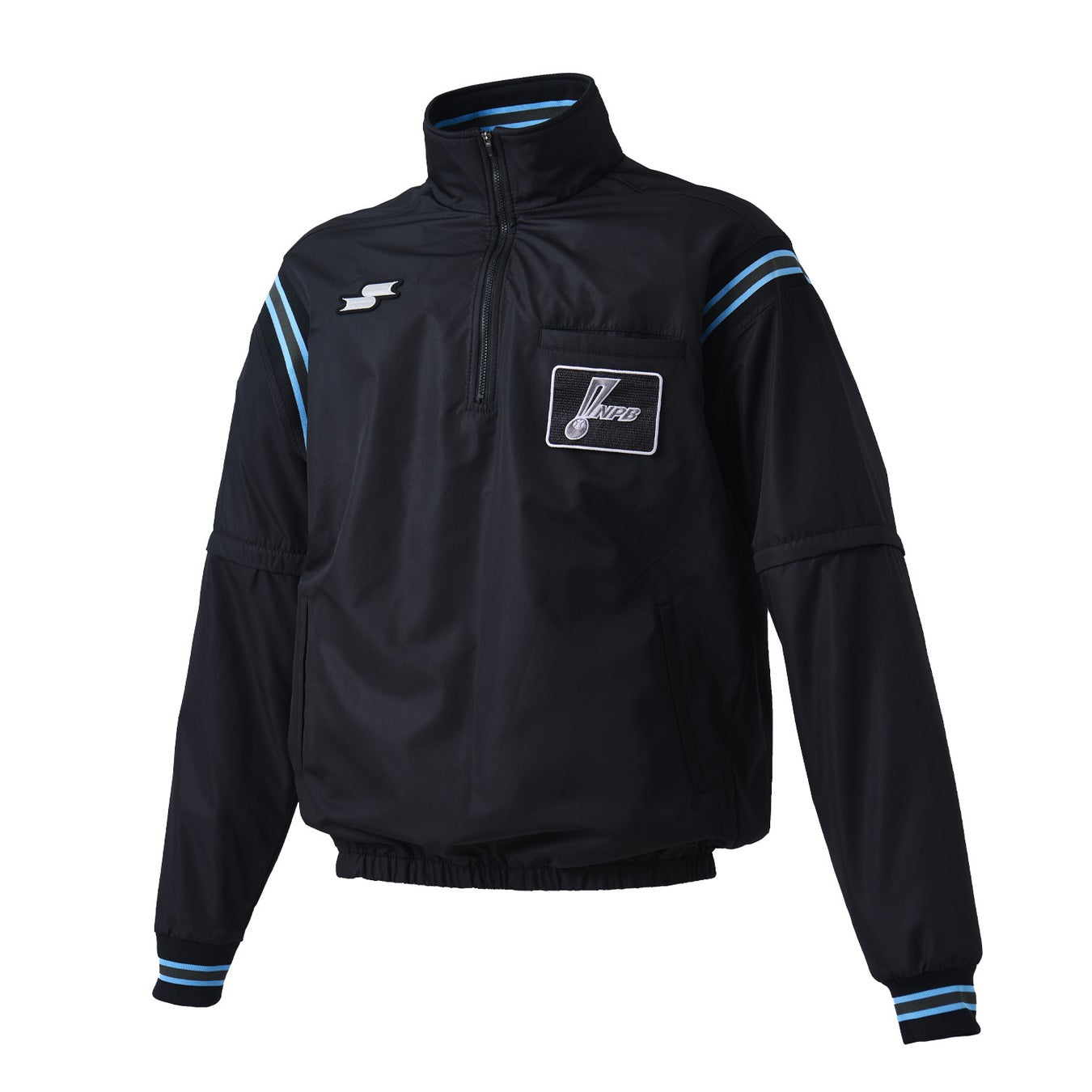 胸と後襟下に刺繡ワッペンのNPBマークが付いたオフィシャルウェアで、寒暖差に合わせて審判員が着用している2WAYジャケット。