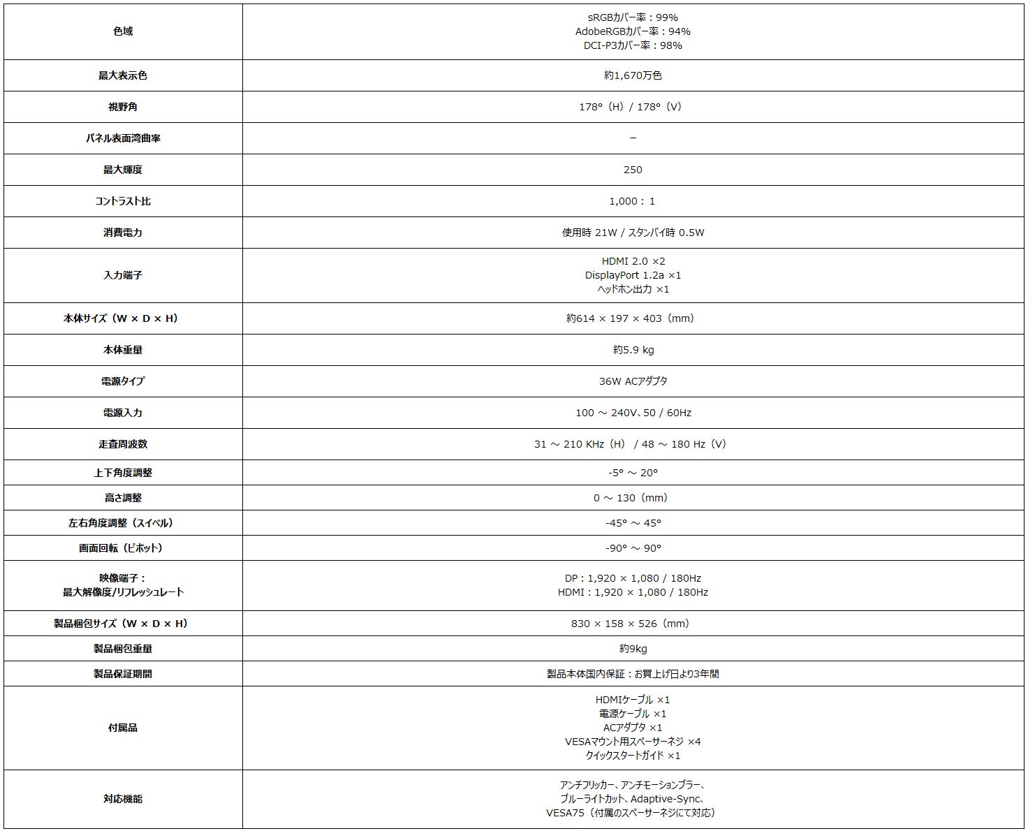 「G274PF」は27インチのフルHD解像度、高画質と高速応答を実現したRAPID IPSパネルを採用しており、一般的な144Hzのゲーミングモニターと比べて36フレームも高速なリフレッシュレート180Hz、応答速度1ms(GTG)の高いスペックを誇り、競技性の高いゲームタイトルに最適です。また、リアルな映像を表現可能なHDR、同期機能としてG-SYNC Compatible、暗いシーンでも視認性を上げるナイトビジョン搭載で高画質な映像でより快適にゲームを楽しみたい方にお勧めなゲーミングモニターです。さらに多機能スタンドによりベストなポジションに容易に調整が可能で、縦表示にすることで対応したゲームやSNSの閲覧も快適に行うことができ、長時間の使用において目の疲労を軽減するアンチフリッカー、ブルーライトカット機能を搭載し、Adobe RGBカバー率:94%、DCI-P3カバー率:98%と広色域表示に対応、1台でゲーミング・クリエイター用途にご使用可能なハイスペックモデルです。入力端子はHDMI 2.0 ×2、DisplayPort 1.2a ×1、に対応しており、PCとゲーム機など複数の機器を接続する事が可能です。背面のジョイスティックを操作することで簡単に入力切り替えやメニュー操作を行うことができます。VESA規格にも対応しており、付属のスペーサーネジを使用する事でモニターアームに取り付ける事が可能です。