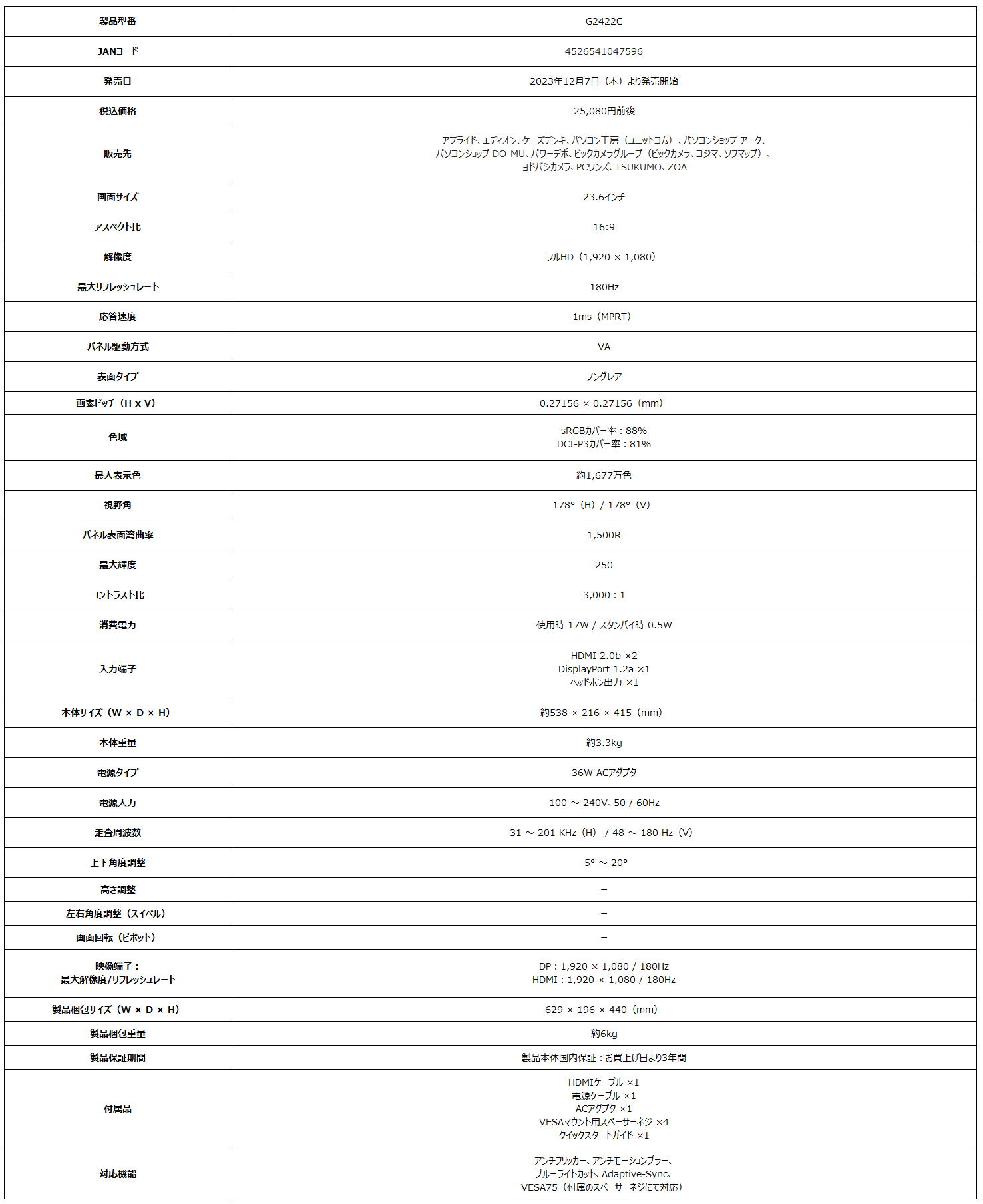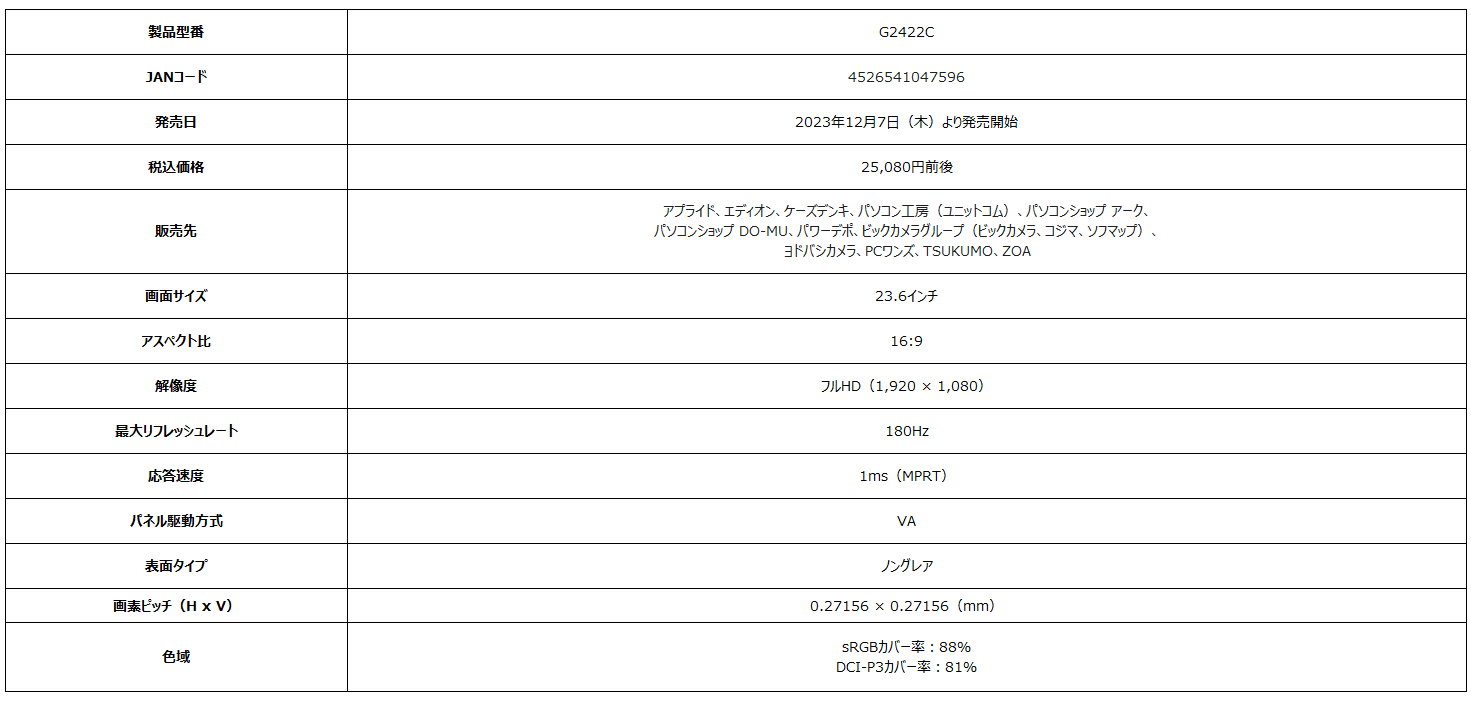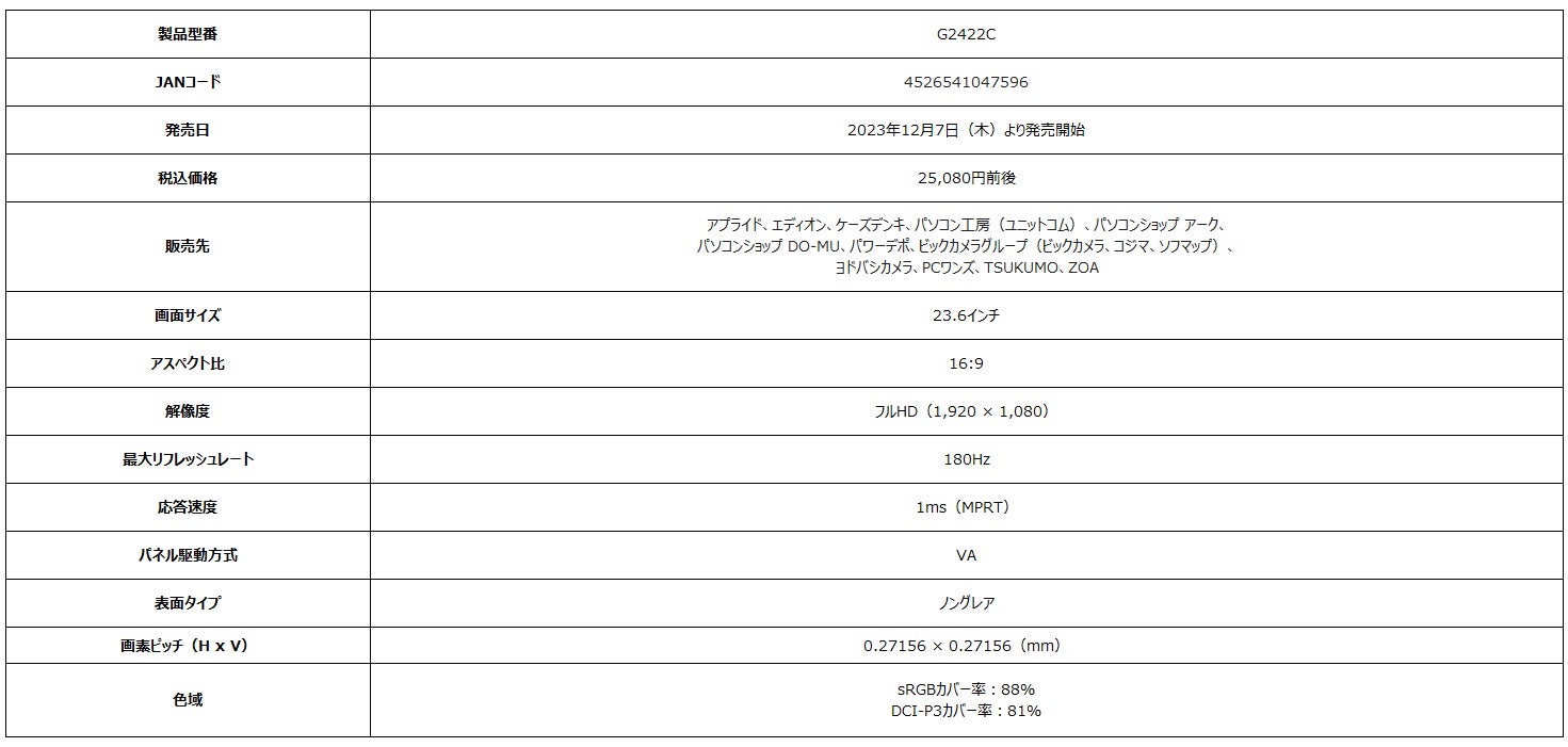 さらに、2023年12月7日(木)よりコストパフォーマンスに優れたゲーミングモニターブランド『G』シリーズより、肉眼に近い湾曲率で高い没入感と高コントラストな映像表示が可能で、リフレッシュレート180Hz・応答速度1ms(MPRT)の高いスペックを誇る「G2422C」が新たにラインナップに加わります。