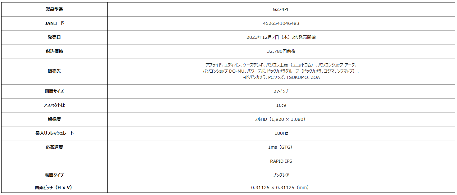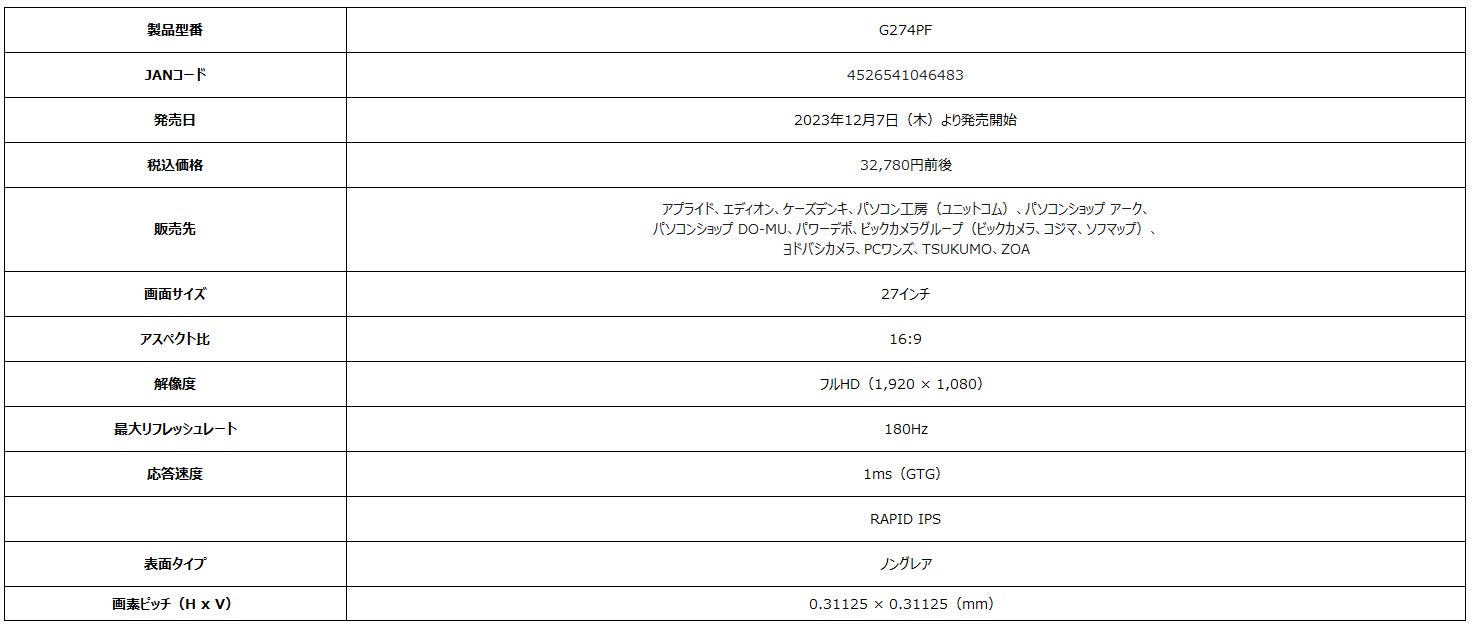 また、2023年12月7日(木)よりコストパフォーマンスに優れた『G』シリーズより、27インチフルHD(1,920 × 1,080)解像度、高速描写と高画質を両立したRAPID IPSパネル、リフレッシュレート180Hz、応答速度1ms(GTG)、縦表示も可能な多機能スタンド、クリエイター向けの広色域をカバーしたゲーミングモニター「G274PF」が新たにラインナップに加わります。