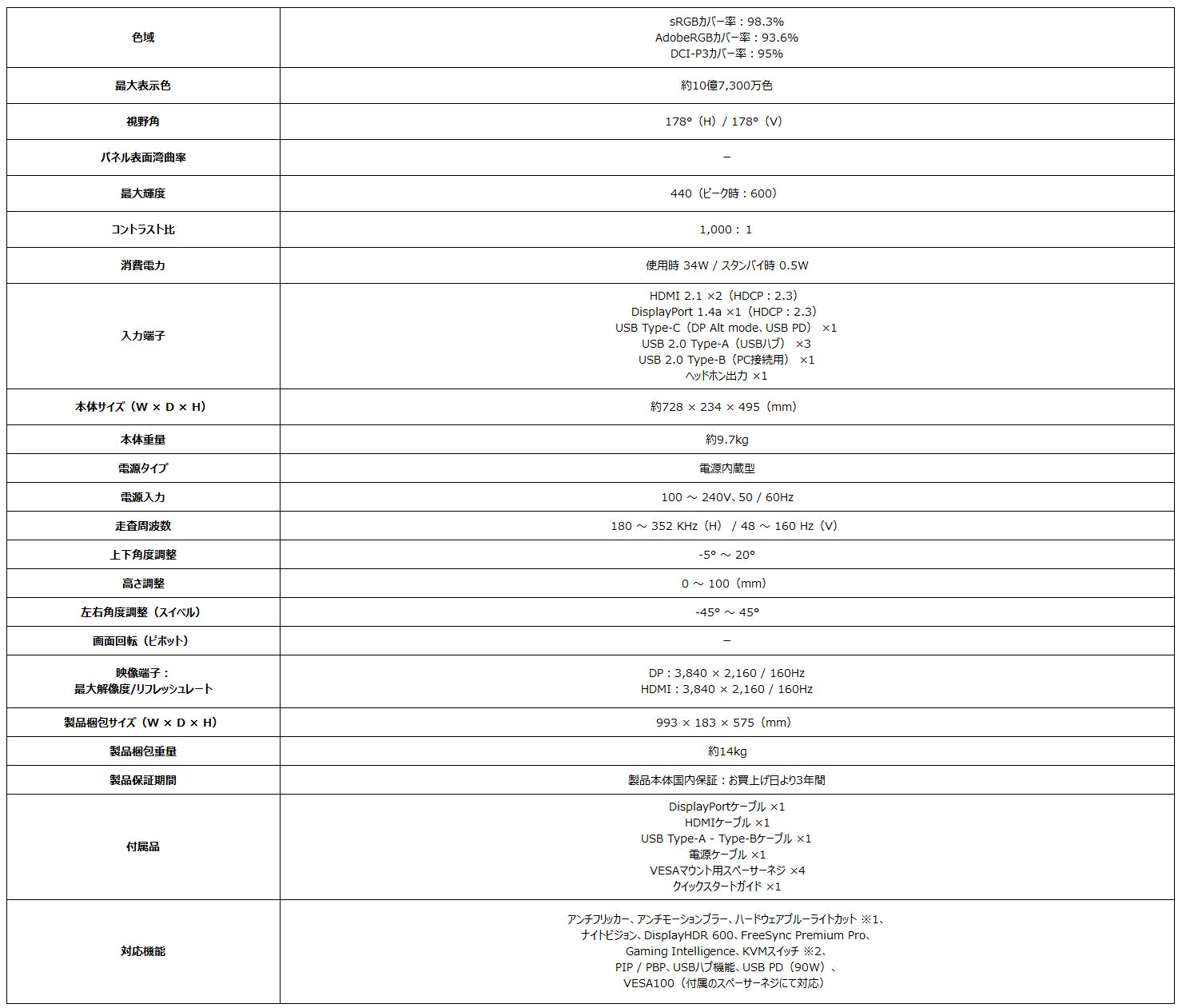 「MAG 323UPF」は大迫力の32インチサイズの4K UHD(3,840 × 2,160)解像度、高画質と高速応答を実現したRAPID IPSパネル、リフレッシュレート160Hz、応答速度1ms(GTG)の高いスペックを誇り、残像感の少ない映像で快適にゲームプレイを楽しむことができます。また、リアルな映像を表現可能なDisplayHDR 600、同期機能としてFreeSync Premium Pro、暗いシーンでも視認性を上げるナイトビジョン、2台のPCでUSB機器を共有可能なKVMスイッチ、PC上からモニターの設定が可能なGaming Intelligence、対応したノートPCやスマートフォン等を急速充電可能なUSB PD90W機能を搭載しており、高精細かつ高画質な映像でよりゲームを楽しみたい方にお勧めなゲーミングモニターです。さらに、長時間の使用において目の疲労を軽減するアンチフリッカー、色味の変化を抑えつつ目の負担を軽減するハードウェアブルーライトカット機能を搭載し、Adobe RGBカバー率93.6%、DCI-P3カバー率:95%の広色域対応でクリエイターにもお勧めで、次世代家庭用ゲーム機との接続で4K / 120Hz、HDR、VRRに対応し、思う存分ゲームを楽しむことが可能です。入力端子はHDMI 2.1 ×2、DisplayPort 1.4a ×1、USB Type-C(DP Alt mode、USB PD)×1に対応しており、PCとゲーム機など複数の機器を接続する事が可能で、背面のジョイスティックを操作することで簡単に入力切り替えやメニュー操作を行うことができ、PCとモニターを付属のUSBケーブルで接続し、専用ソフトを導入する事によりPCで上から各種設定変更が可能なGaming Intelligence機能にも対応しております。VESA規格にも対応しており、付属のスペーサーネジを使用する事でモニターアームに取り付ける事が可能です。