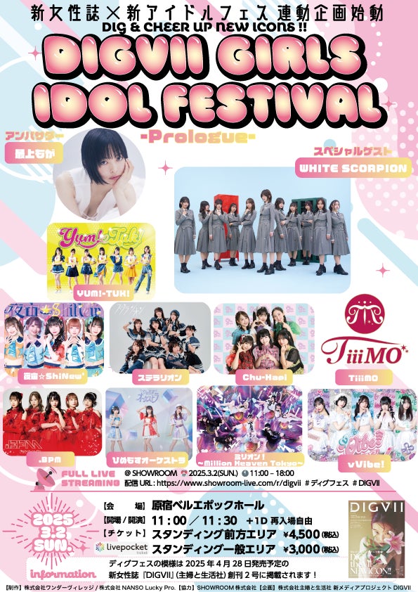 主婦と生活社が企画する音楽イベント『DIGVII GIRLS IDOL FESTIVAL -Prologue- 』が2025年3月2日(日) に原宿ベルエポックホールにて開催決定! フェスの模様はSHOWROOMにて無料生配信されます。「DIG & CHEER UP NEW ICONS!!」をコンセプトに、ライブアイドルシーンからの新たなアイコンの発掘を行ってまいります。