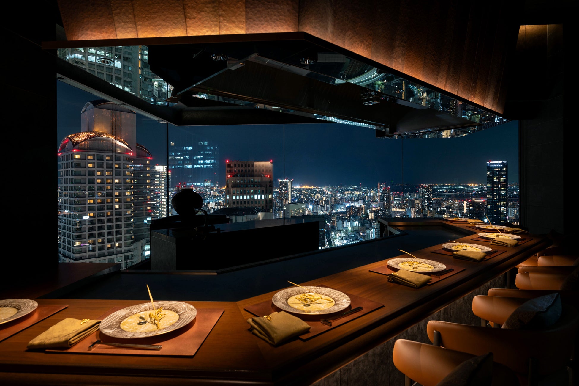 全長約12メートルのロングカウンターや、きらびやかな大阪の景色を一望するコーナーカウンターが特徴的な鉄板焼。江戸時代には何でも揃う“天下の台所”と謳われ、全国の産品の大集積地であった大阪、その食文化の豊かさを現代に表現します。