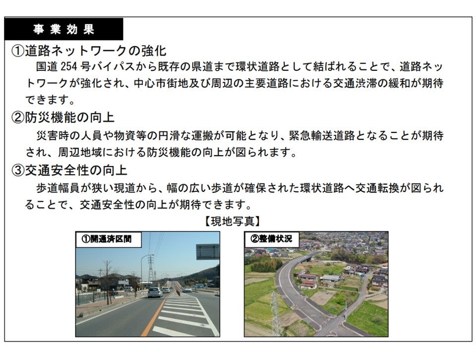 事業効果としましては、道路ネットワークが強化され、交通渋滞の緩和や防災機能の向上が図られるとともに、交通安全性の向上が期待できます。また、開通に先立ち、同日午前10時から開通記念式典を行います。