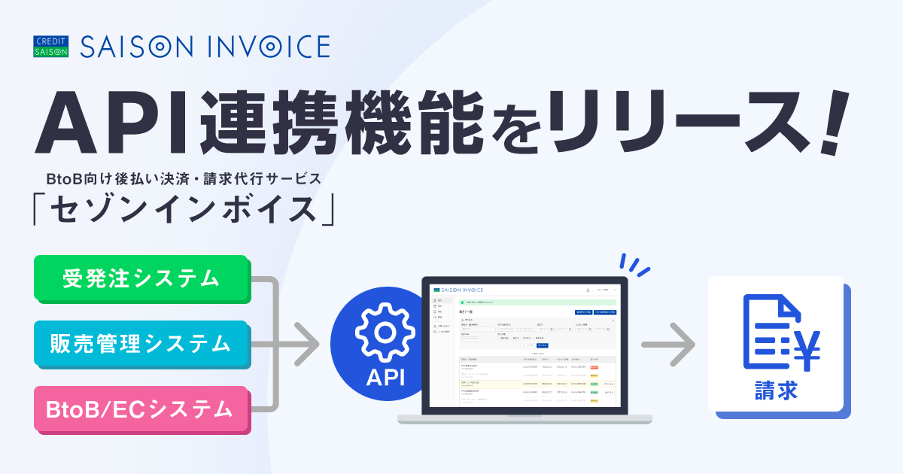 エキサイト株式会社(所在地:東京都港区、代表取締役社長:西條晋一)と株式会社クレディセゾン(所在地:東京都豊島区、代表取締役(兼)社長執行役員 COO:水野克己)が提供するBtoB向け後払い決済・請求代行サービス「セゾンインボイス」は、外部システム(販売管理システム、受発注システム、BtoB ECシステム等)の連携を可能にするAPI連携機能をリリースしました。
