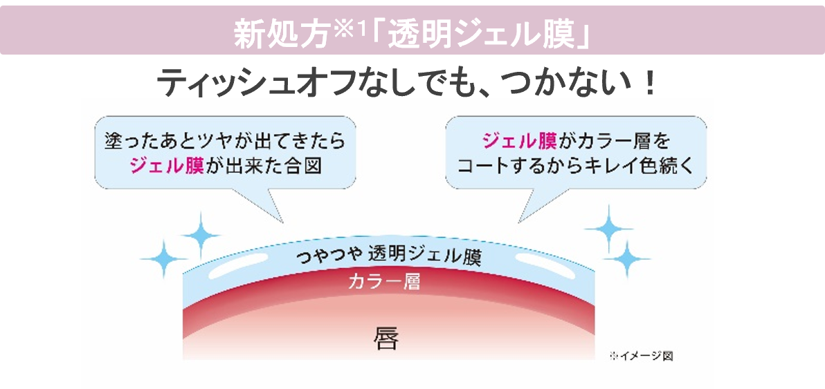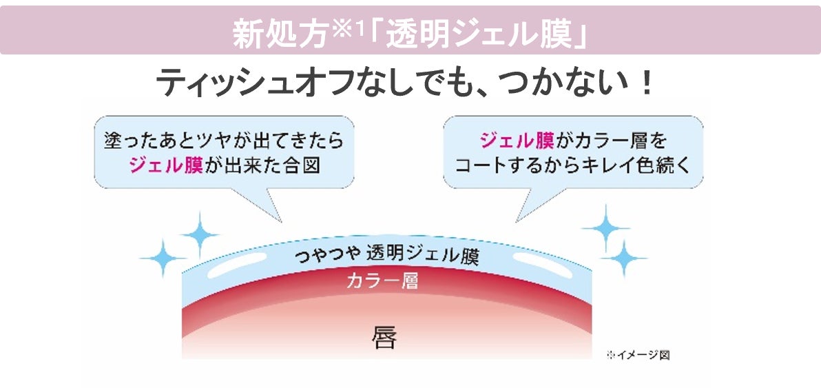 唇に色が密着し、「透明ジェル膜」が唇をコート。