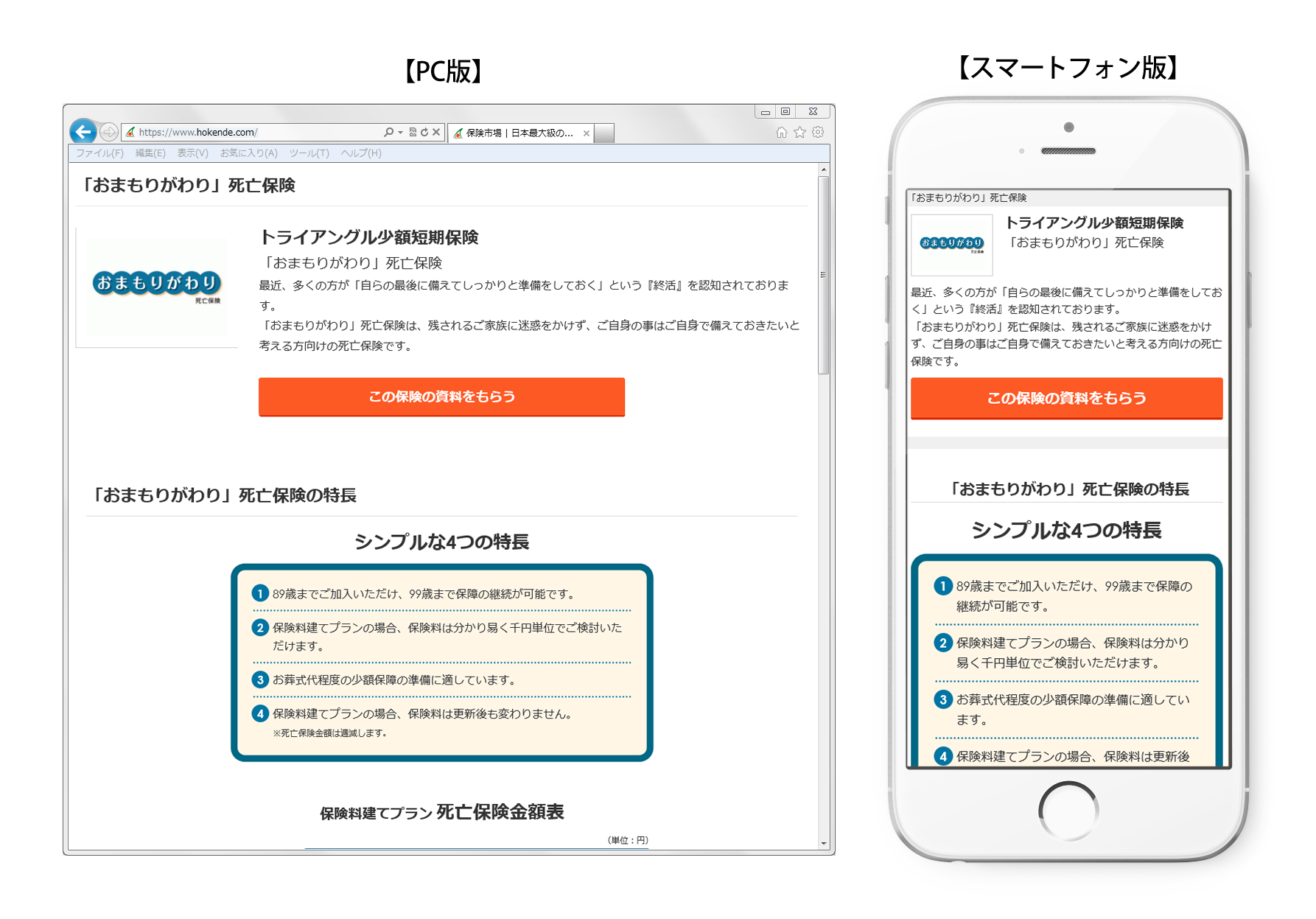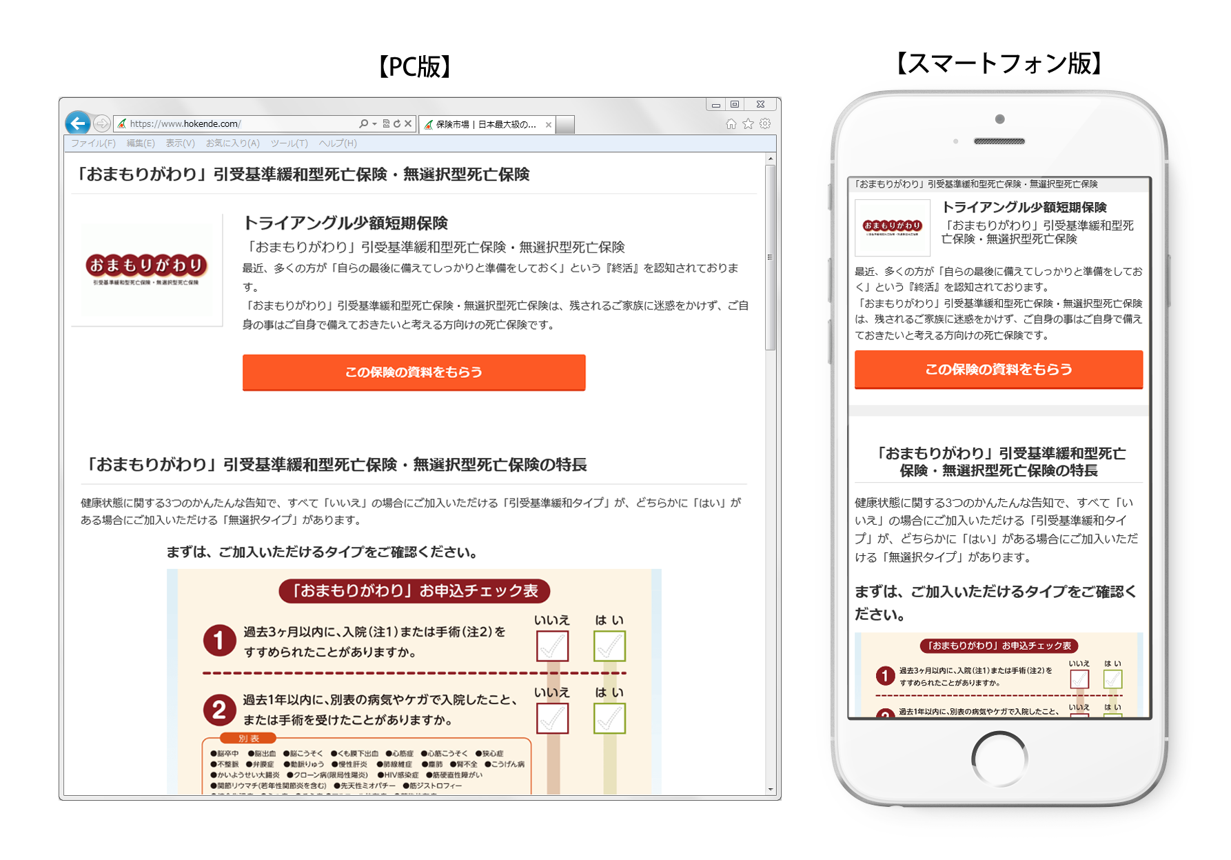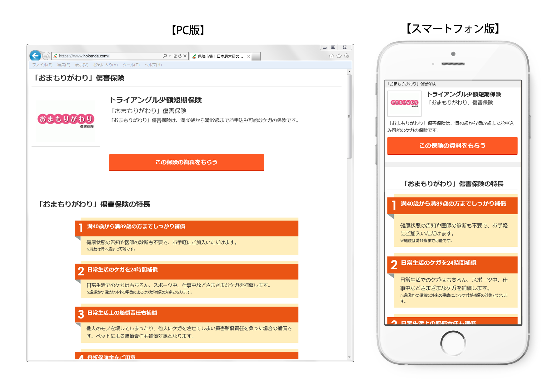 保険選びサイト「保険市場」に掲載を開始したトライアングル少額短期保険の「おまもりがわり」死亡保険、「おまもりがわり」引受基準緩和型死亡保険・無選択型死亡保険、「おまもりがわり」傷害保険は、通信販売でお申し込みいただける保険商品です。「保険市場」PCサイトおよびスマートフォンサイトにて、商品の詳細をご確認いただけます。
