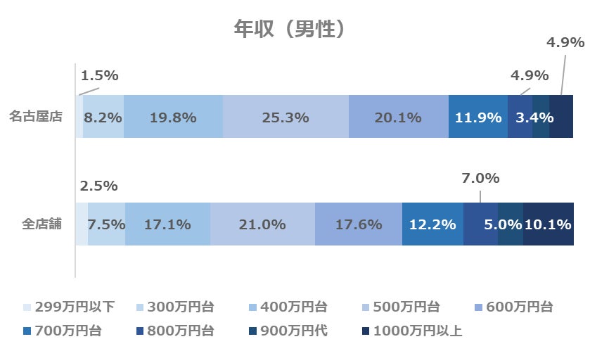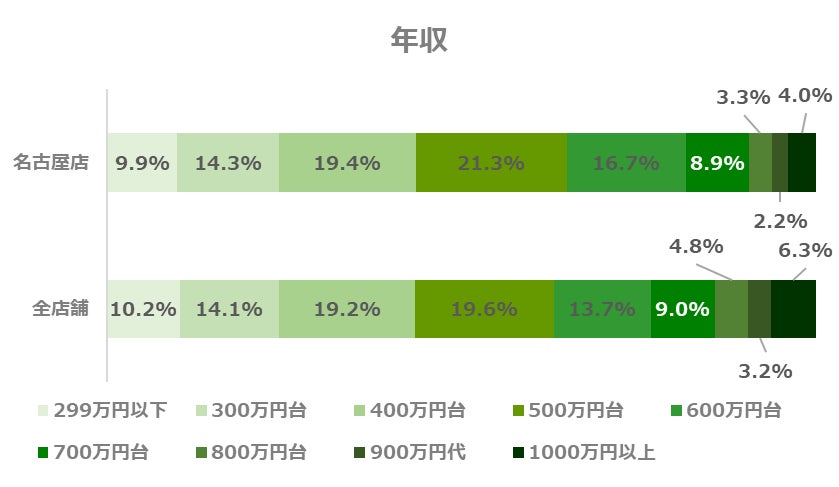 名古屋店では、全店舗と同様に年収500万円台が、最も多い層となっています。