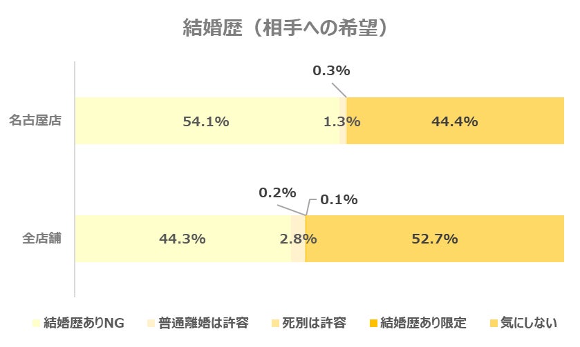 あわせて、お相手に求める結婚歴についてのデータを見てみると、「結婚歴ありNG」と回答した方の割合は全店舗と比べ高い傾向にあります。