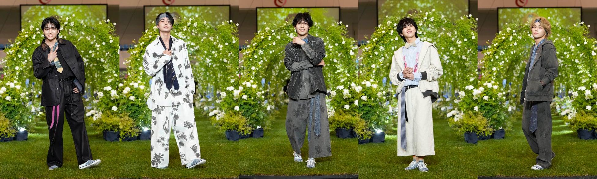 FUKUYAMA speciality collectionでは、ばらのモチーフや福山市特産のデニムを取り入れてコーディネートしたファッションショーを展開。村重杏奈がトップバッターで登場し、華やかにショーがスタートしました。TGCでも人気の雑賀サクラ、大久保波留(DXTEEN)、米澤りあ、鶴嶋乃愛が続々登場し、柏木由紀がラストを飾ると会場から大歓声があがりました。続いてFUKUYAMA original collectionでは、全身Made in FUKUYAMAで取り揃えたスタイリングで、俳優やモデルとしても活躍し、ますます注目を集めている5人組ボーイズグループWILD BLUEが、華麗に着こなしランウェイに登場すると、会場のボルテージは最高潮に!