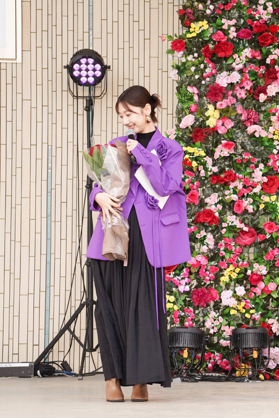 「福山市に来るのは2回目だったのですが、ばらに囲まれた本当に素敵な街で、あと、お越し下さっている皆さんもすごく温かくて熱量もあって、この後のFukuyama Rose Runway produced by TGCのステージで皆さんにまたお会いするのを楽しみにしています!この後も引き続き、皆さん楽しんでいってくださいね!!」とメッセージを届けました。