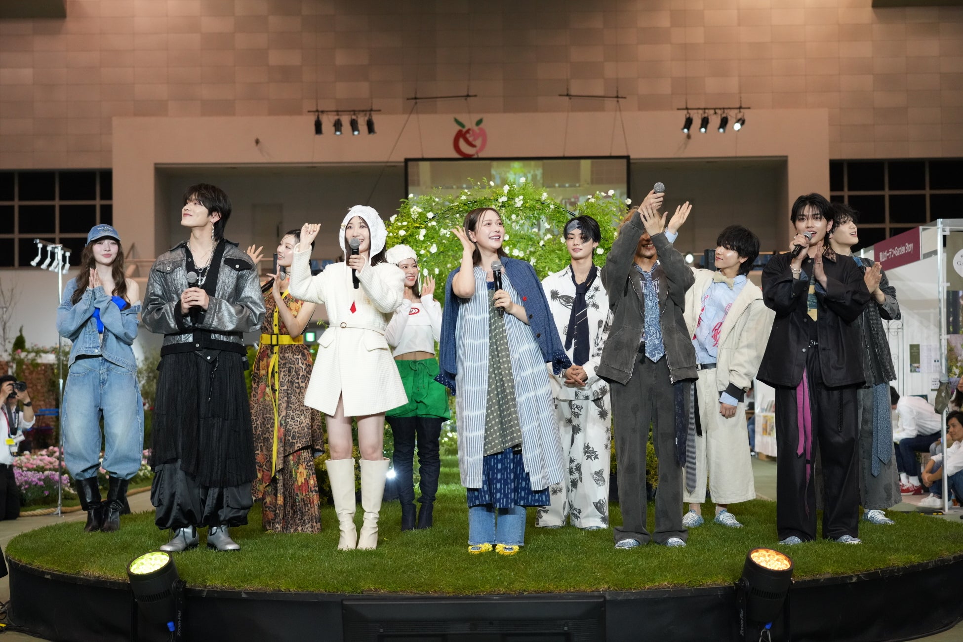 トークステージでは、柏木由紀が今日の衣装について「バブーシュカに細かくばらが施されているのと、白と赤の衣装がばらの色をイメージしています!」「普段のTGCと違ってばらのアーチのランウェイはすごく緊張したけれどワクワクしました。」と語り、ばらが大好きという鶴嶋乃愛は、「福山駅からばらの花が咲き乱れていて、お花の中で一番大好きなばらに囲まれて幸せ空間で福山に住んでみたいなと思いました!今日は、日本でばらの街があることを知ることができて嬉しかったですし、ばらに囲まれてお仕事できて幸せ者です!ピンクのばらが好きで、最近“ショートケーキ”という品種がお気に入りです!」。昨年からローズモチーフのアイテムがZ世代のトレンドと聞き、米澤りあは「今日の衣装のハンチングもばらがたくさんついていてとても可愛いです。Z世代では、ばらが付いている首飾りが流行っていると思います。」雑賀サクラは「福山市は国内最大のデニムの産地で福山市のデニムメーカーさんに協力いただきました。デニムがトレンドなので全身デニムで揃えてもらいました。抜け感を出しながらコーデすると良いと思う。」と着こなしのアドバイスも。福山のデニムは全国シェア8割を占めていると聞いた村重杏奈は「福山デニムは知らなかったのですが、勉強して帰りたいと思います。デニムを着ている人がいたら、デニムの8割は福山産って知ってる?って、みんなにマウント取りたいと思います!」と語り、また、今日の衣装が福山市の伝統工芸品のひとつの備後絣だと知ると、「着心地が良すぎてこのまま帰りたい!この後移動が長いので、移動服としてもおしゃれでいいなと思いました!」と感想を述べました。大久保波留(DXTEEN)は、「かっこよく歩きたいと思っていたのですが、ランウェイのばらの香りがとてもいい香りで気持ちよく歩けました!デニムは衣装でもよく着ますが、キラキラしたデニムは中々ないのでこれからプライベートでも着たいと思いました!」