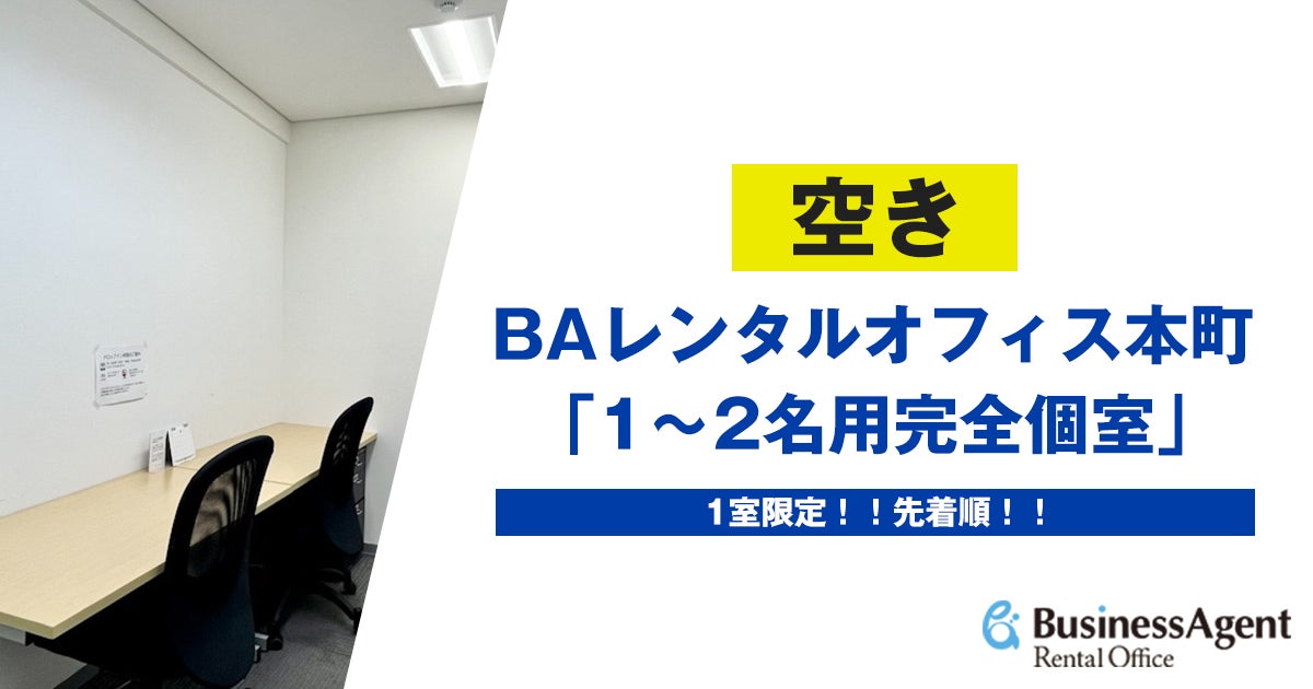 【人気の個室に空室発生】レンタルオフィス「1~2名用完全個室」|本町駅徒歩5分のロケーションで快適なビジネス空間を提供