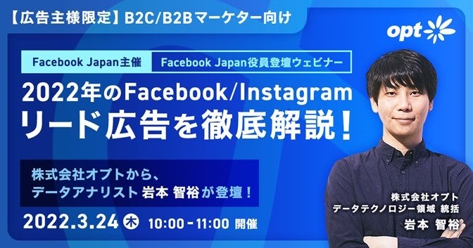 岩本は、「B2B/B2Cリード広告の活用事例」に登壇します。オプトが提供する統合データ活用プラットフォーム「ONE's Data(ワンズデータ)(※1)」を活用し、問い合わせ数などオンライン広告におけるオンライン成果と、商談数、成約数などオフライン成果を紐付けし、Facebook/Instagram 広告の配信で広告体験、顧客体験を向上することによって企業様における事業成果の拡大に取り組んだ事例をお話いたします。