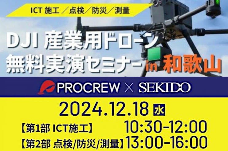 DJI(ディージェイアイ)正規販売代理店としてドローンビジネスの最先端を支える株式会社セキド(本社:東京都港区、代表取締役:⼤下貴之)では、株式会社プロクルー(本社:滋賀県長浜市、代表取締役:酒井正裕)、ナカト産業株式会社(本社:和歌山県西牟婁郡、代表取締役:中井政斗)と共同で12月18日(水)に和歌山県西牟婁郡にて、ICT施工や点検、測量業務でのドローン活用について実演を交えてご紹介する「産業用ドローン ICT施工/高所点検/防災/測量 無料実演セミナー」を開催いたします。