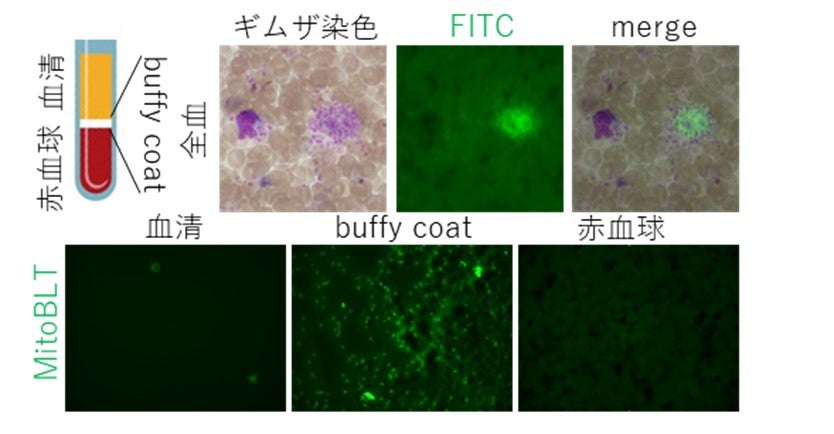 全血中では血小板に一致して緑のシグナルを認め、buffy coatに一致してシグナルを認める