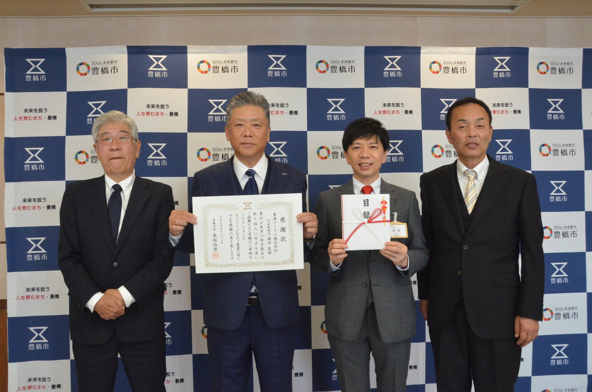 10月23日(木)、豊橋市はご寄附いただいた企業のうち3社に市役所で感謝状を贈りました。寄附目録の贈呈に続き、長坂尚登市長が各社の代表者に感謝状を手渡しました。