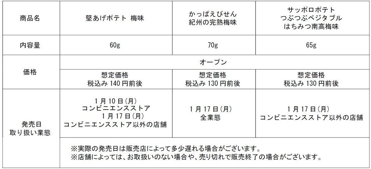 カルビー株式会社(本社:東京都千代田区、代表取締役社長:伊藤 秀二)は、梅の開花時期に合わせて3つの人気ブランドから新春にピッタリの「梅味」の新商品『堅あげポテト 梅味』『かっぱえびせん 紀州の完熟梅味』『サッポロポテトつぶつぶベジタブル はちみつ南高梅味』を2022年1月10日(月)以降、期間限定で順次発売いたします。