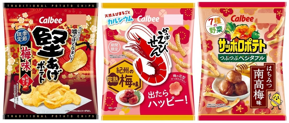 カルビーでは、毎年、梅が開花するこの時期(1~2月)に、梅好きのお客様に向けて梅味の新商品を発売しています。今年は3つの人気ブランドから同時期に梅味の商品を発売し、様々な食感と風味でお客様にお好みの梅味を選んでいただく楽しさと美味しさを提供してまいります。
