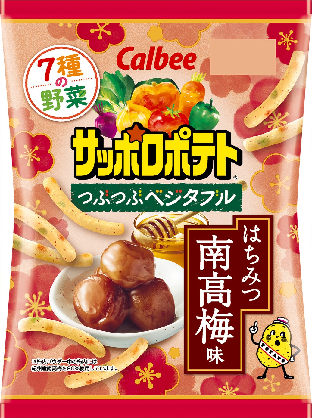 ●『サッポロポテトつぶつぶベジタブル はちみつ南高梅味』は、紀州産南高梅※3のはちみつ漬けの味わいを「サッポロポテトつぶつぶベジタブル」で再現。2種類の梅肉パウダーを使用し、見た目も楽しみながら、はちみつの甘みと爽やかな梅の酸味が味わえます。パッケージは、やさしい色合いで描かれた梅の花びらのイラストに、はちみつ南高梅のシズルを大きく中央に配置し、味わいが想起しやすいデザインです。