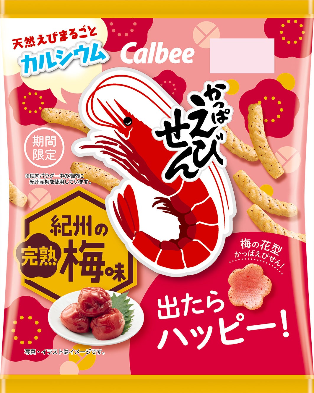 ●『かっぱえびせん 紀州の完熟梅味』は、紀州産完熟梅※2の甘酸っぱい味わいが、“やめられない、とまらない♪”。最初の酸味とあとに残る心地よい甘みが、香ばしいエビの風味に良く合います。春の訪れを感じられる梅の花びら型の「かっぱえびせん」がお楽しみで入っているかも!?パッケージは、梅の花びらを背景に散りばめた春らしく明るいデザインで、花びら型の「かっぱえびせん」を大きく掲載して親子で楽しめる味わいを訴求しています。