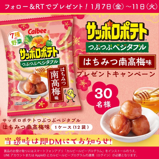 ●「サッポロポテト」公式Twitterアカウント(@ CalbeeSapporoCP)をフォローし、キャンペーン投稿をリツイートした方の中から、抽選で30名様に『サッポロポテトつぶつぶベジタブル はちみつ南高梅味』(12袋)をプレゼントします。
