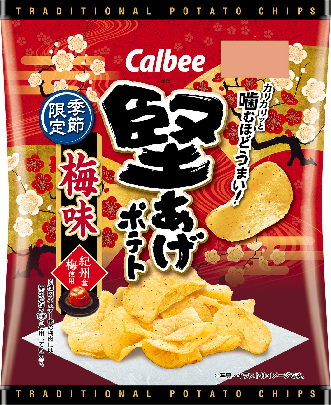 ●『堅あげポテト 梅味』は、シンプルな梅の美味しさと酸味を梅しそパウダーで引き立て、隠し味に黒糖を使用して、ほのかな甘さで深みのある本格的な味わいに仕上げました。紀州産梅を100%使用※1しています。パッケージは、上質感のある落ち着いた赤色に、華やかな金色の扇をあしらい、本格的な味わいを表現した和風のデザインです。